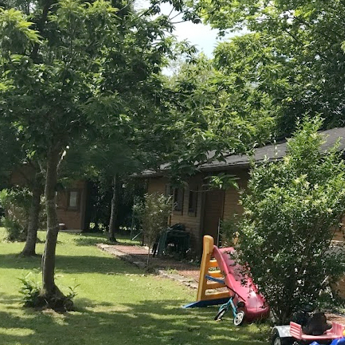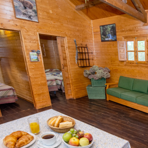 Les cabanes en bois sont situées au sein du camping rural et disposent devant elles d’un espace vert particulier, bien délimité et avec tables et chaises de jardin.
